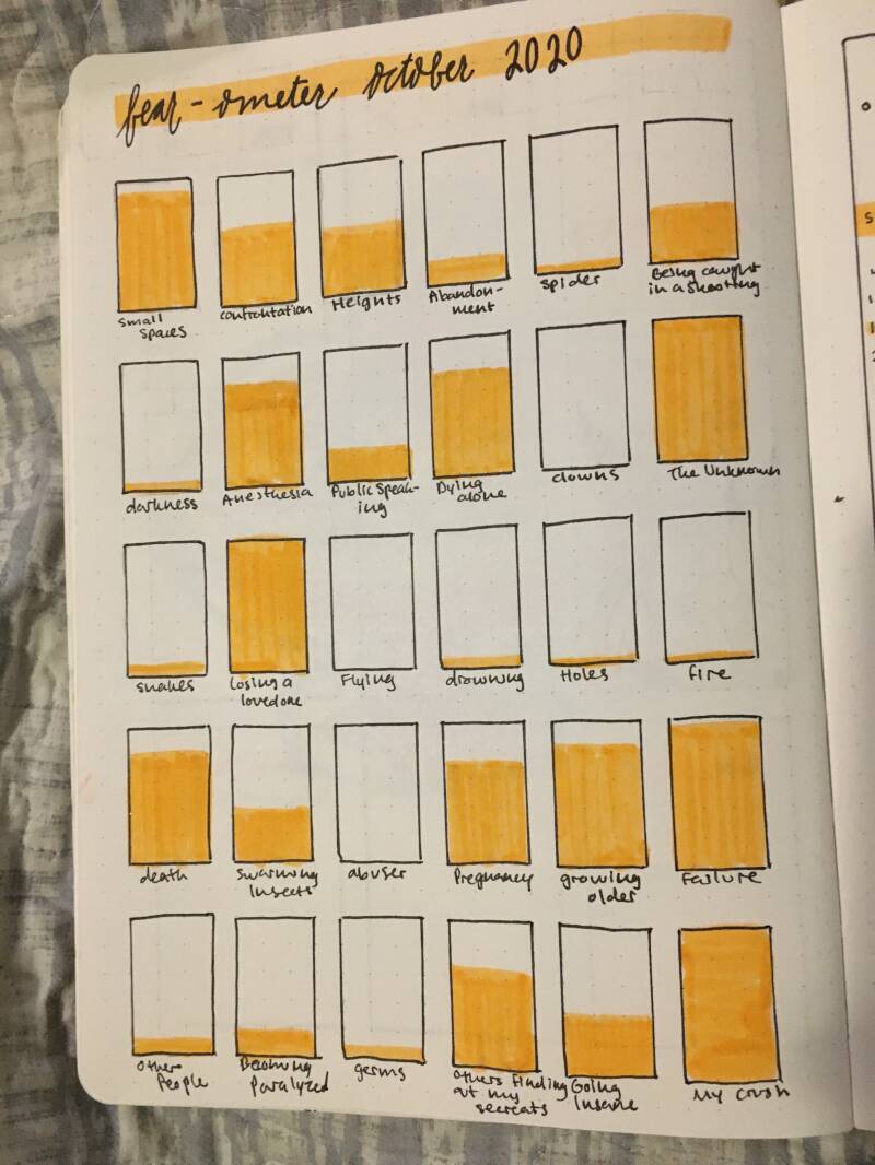 Since it's October I had to make a fear-o-meter. I was inspired by the Jar of Fears trend on Pinterest. Overall though, my greatest fear is trains, which is kind of embarrassing. A lot of people thinks it's weird that I'm not that scared of spiders. I'm not really scared of bugs unless they crawl on me. I ardently hate small, confined spaces, probably because when I was little some kid in my preschool class shut me in their toy chest and wouldn't let me out. Heights aren't too bad, but I'm very careful hiking near cliffs. I've never really been afraid of the dark unless I've just watched something scary. Public speaking is stressful, but it's not much of a fear of mine. I've never been afraid of clowns, I just think they are weird. Snakes are kind of scary. I saw one on my run of Saturday. Losing a loved one is a 100% fear. Drowning is scary, especially since I'm so bad at swimming butterfly. I'm not afraid of fire. Death is a big one. I don't like thinking about the future very much, so I don't like the thought of growing older. I'm not that afraid of germs, but it depends. If you try to touch my face with germy hands I will not be pleased. Definitely afraid of anesthesia. Dying alone is big. The unknown is not something I like to think about. I am definitely not afraid of flying. I do not like failing in things that I really care about. Becoming paralyzed would stink. I'm really bad at keeping secrets, except for one that only two other people know about and I would die if anyone else did. Another fear I put down is my crush. I get really nervous when he is nearby. I wouldn't really say I'm afraid of him, I just lose the ability to act like a normal person, and I hate looking like a fool infront of him. Anyways, those are all the fears!!