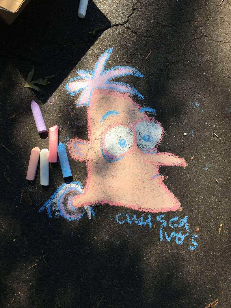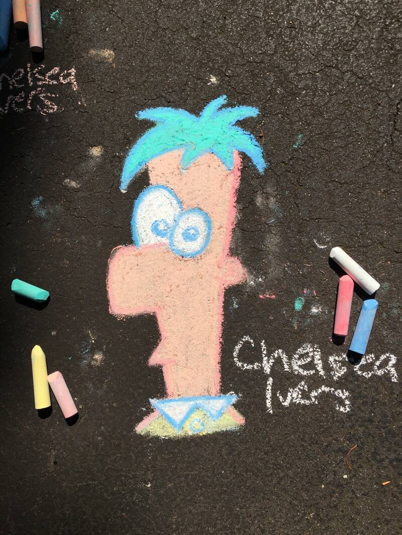The wait is over!! I finally pulled out the old box of chalk and decorated my driveway! Chalk is super fun, but SO messy!! My hands and clothes were all covered in green chalk by the time I finished the Perry the Platapus drawing. But I still completely recommend!!